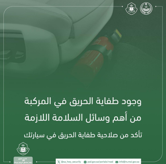 وتقدم قوات أمن الطرق بالتعاون مع الجهات الأمنية والمرورية إرشادات لقائدي المركبات بشكل مستمر لتعزيز السلامة المرورية، والتي تضمنت مؤخرًا التأكيد على ضرورة وجود طفاية الحريق بالسيارة باعتبارها من أهم وسائل السلامة حال نشوب حريق.