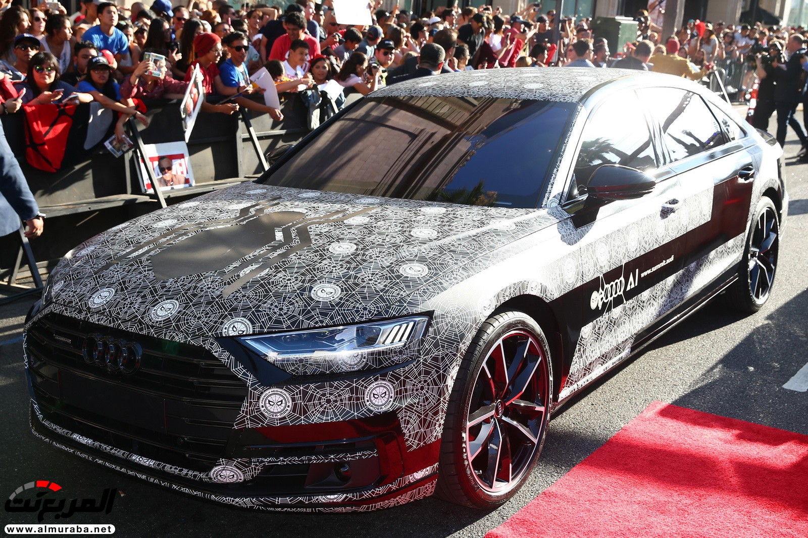 حيث جلبت أودي سيدانها الرائدة أثناء العرض الأول للفيلم بنموذج مموه بملصقات يجعلها كما لو أنها شبكة عنكبوت، ليقوم الرجل العنكبوت المعروف ببيتر باركر والذي يؤدي توم هولاند دوره، بالصعود فوق غطاء محرك الـ A8 المموهة ومن ثمّ أخذ بضعة صور السيلفي مع الحشود المتجمعة في الفعالية، بينما وصل كلا من توني ستارك (روبرت داوني جونيور) وهابي هوجان (جون فافرو) معًا في R8 سبايدر سوداء.
