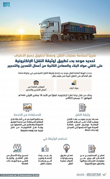 المربع نت – أعلنت الهيئة العامة للنقل، عبر حسابها الرسمي على تويتر، عن موعد بدء إصدار “وثيقة النقل” الإلكترونية على ناقلي مواد البناء والمعادن الناتجة من أعمال التعدين والتحجير، بهدف تعزيز سلامة عمليات النقل، وللحفاظ على حقوق جميع الأطراف.