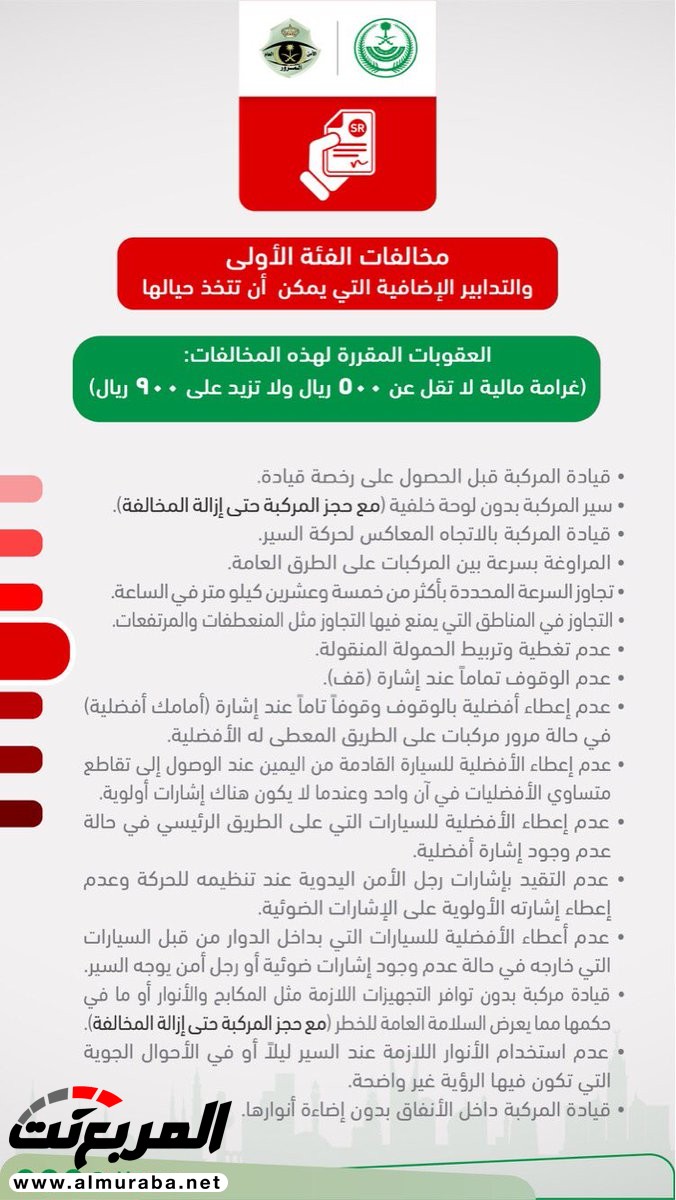 لائحة المخالفات المرورية المغلظة بحسب قرار مجلس الوزراء السعودي والتي لا ترتفع لحدها الأعلى إلا بقرار هيئة الفصل بالمخالفات المرورية كالتالي: