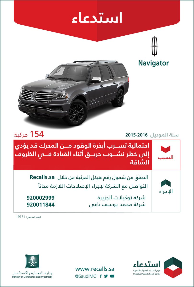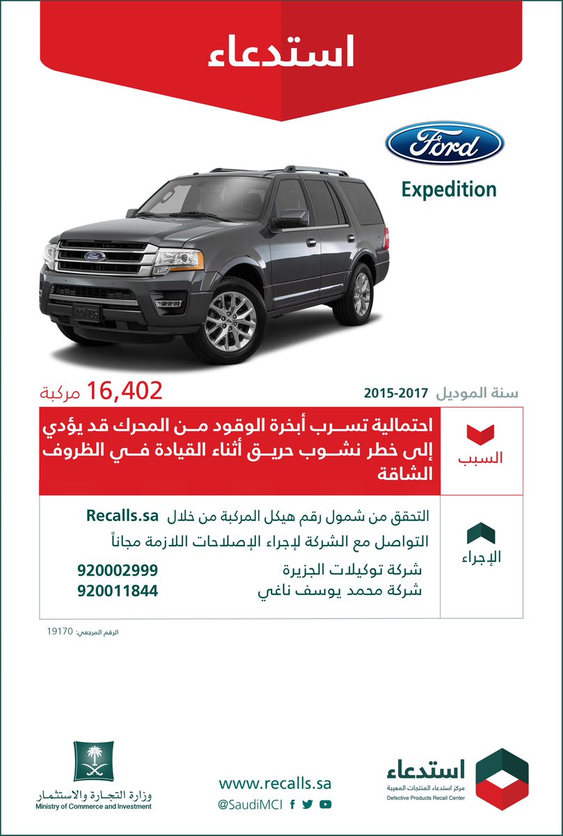 المربع نت – أعلنت وزارة التجارة والاستثمار عن استدعاء 16,402 سيارة فورد “Expedition” و154 سيارة لينكون “Navigator”، موديلات 2015-2017، وأكدت على ضرورة التحقق من شمول الرقم التسلسلي للسيارة من خلال موقع Recalls.sa.