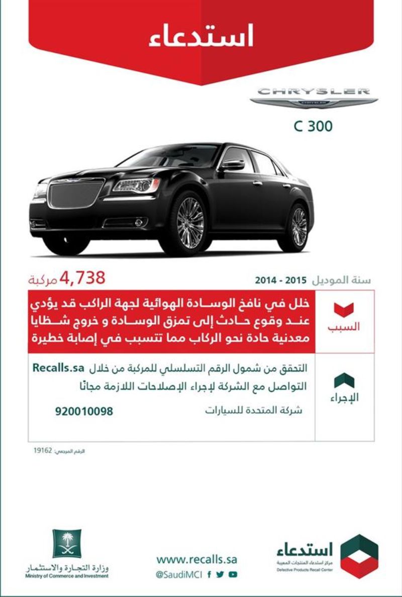 المربع نت – استدعت وزارة التجارة والاستثمار 10,478 سيارة كرايسلر C300 موديلات تبدأ من 2005 إلى 2015، وأكدت على أهمية التحقق من شمول الرقم التسلسلي للسيارة من خلال Recalls.com.