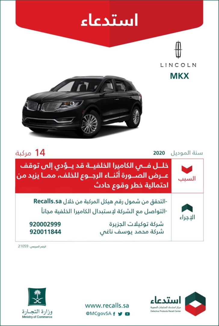 المربع نت – استدعت وزارة التجارة 1,783 سيارة منهم سيارات فورد “EXPEDITION /F-150 / EDGE / EXPLORER /MUSTANG” وسيارات “لينكون “MKX”موديلات 2020، مشيرة إلى ضرورة التحقق من شمول الرقم التسلسلي للسيارة من خلال موقع Recalls.Sa.