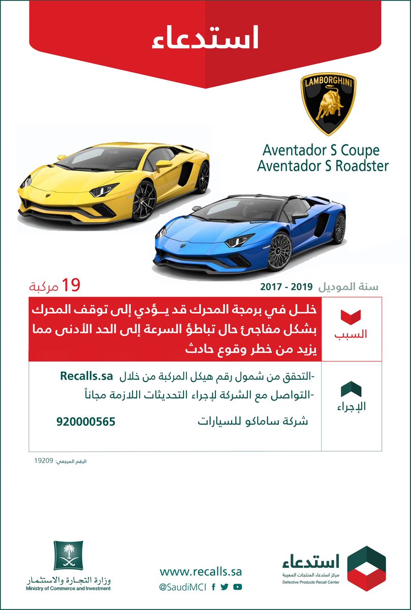 المربع نت – استدعت وزارة التجارة والاستثمار 19 سيارة لامبورجيني “ventador S Coupe” و”Aventador R Roadster” موديلات (2017-2019)، وأكدت على أهمية التحقق من شمول الرقم التسلسلي للسيارة من من خلال Recalls.Sa.