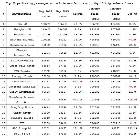 مبيعات بكين هيونداي تعدت حاجز المئة ألف وحدة الشهر السابق، بنمو سنوي بـ 25.4%، وتكمل الشركات الآتية قائمة العشر شركات الأكثر رواجا في شهر مايو: دونجفينج نيسان، تشانجان، SAIC-GM-Wuling، جريت وول موتور، FAW تويوتا، جوانكي هوندا، وتمثل مبيعات الشركات العشرة الاوائل 56.3% من كل السيارات المباعة في الصين في الشهر السابق.