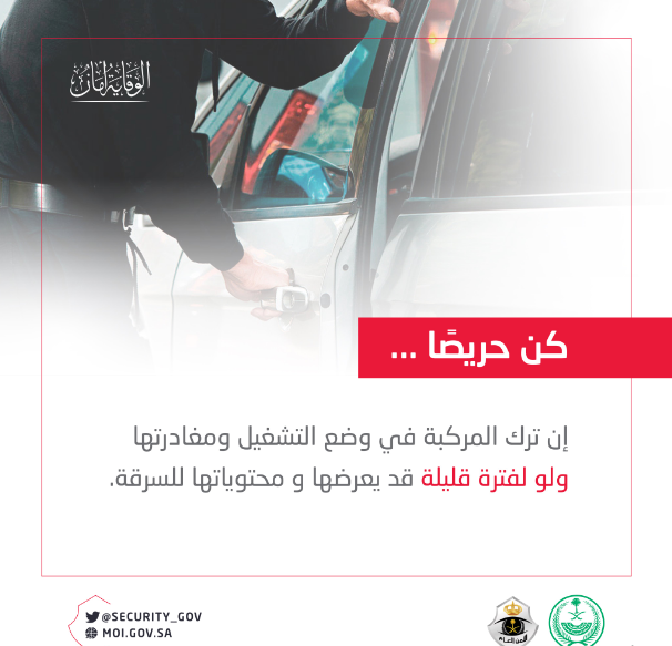 وأكد الأمن العام من خلال تغريدة له عبر “تويتر” على عدم ترك المركبة في وضع التشغيل ومفتوحة كي لا تتعرض للسرقة، قال فيها: “كن حريصًا.. إن ترك المركبة في وضع التشغيل ومغادرتها ولو لفترة قليلة قد يعرضها ومحتوياتها للسرقة”.