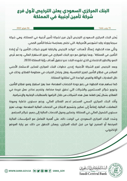 وأوضح البنك المركزي السعودي أن الترخيص لفرع الشركة الأجنبية، يعد إحدى الخطوات الهامة لتمكين الاستثمار الأجنبي المباشر في قطاع التأمين لتعزيز التنافسية بين الشركات العاملة في هذا المجال، ونقل وتبادل الخبرات في منظومة قطاع التأمين، وذلك في ظل المقدرات الهائلة والفرص الواعدة التي تمتلكها المملكة.