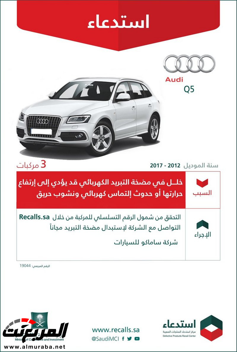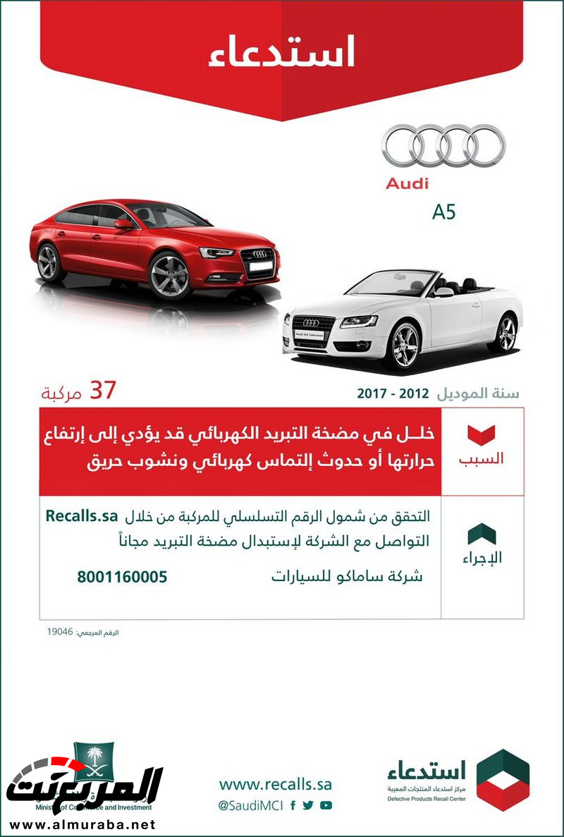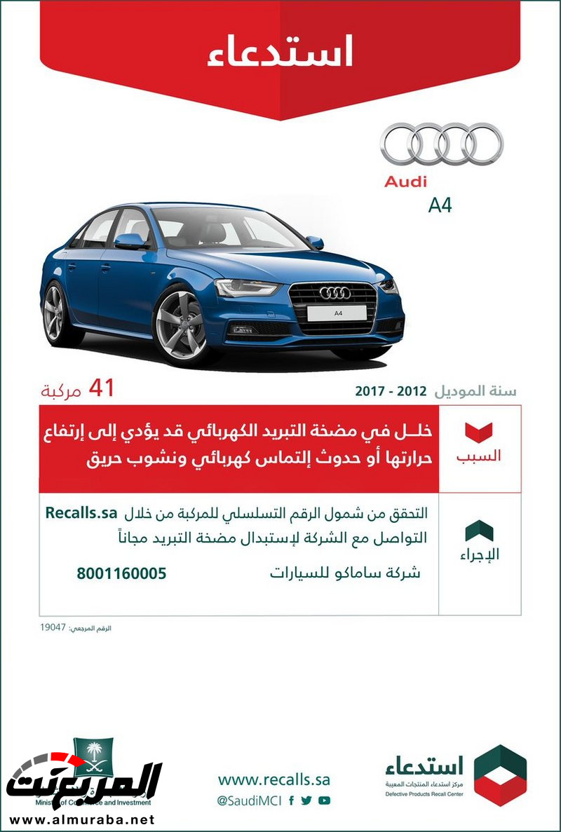 المربع نت – استدعت وزارة التجارة والاستثمار 1181 سيارة Q5/A6/A5/A4 Audi، موديلات “2012-2017″، ودعت إلى التحقق من شمول الرقم التسلسلي للسيارة من خلال Recalls.Sa.