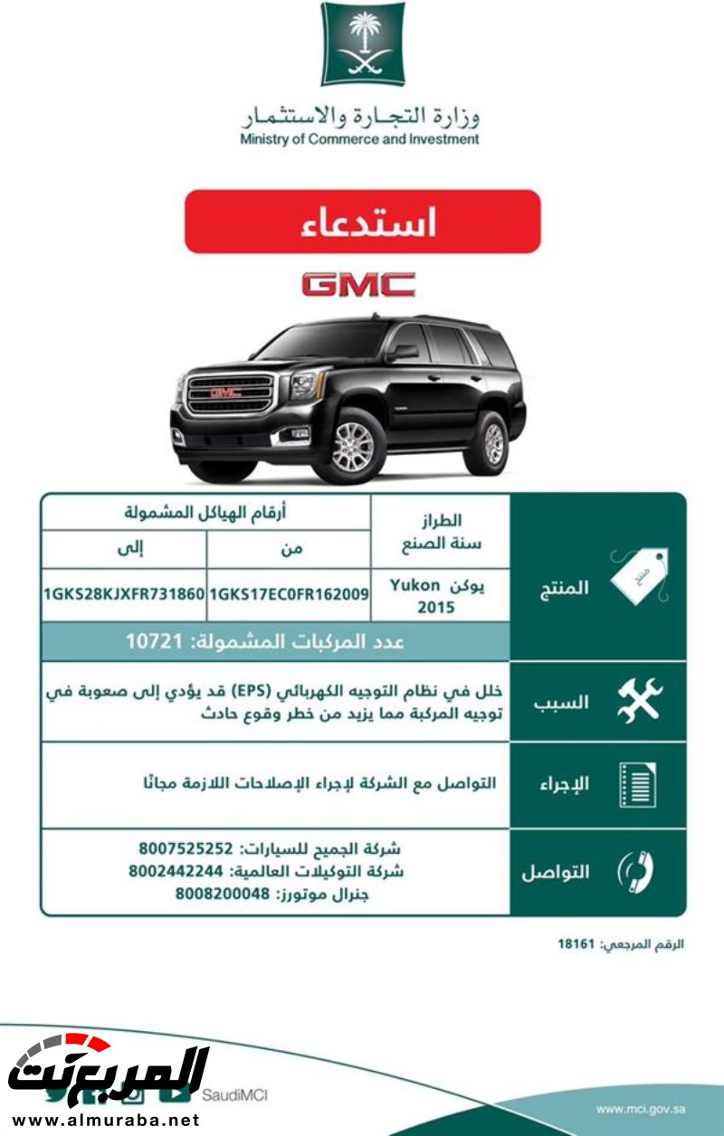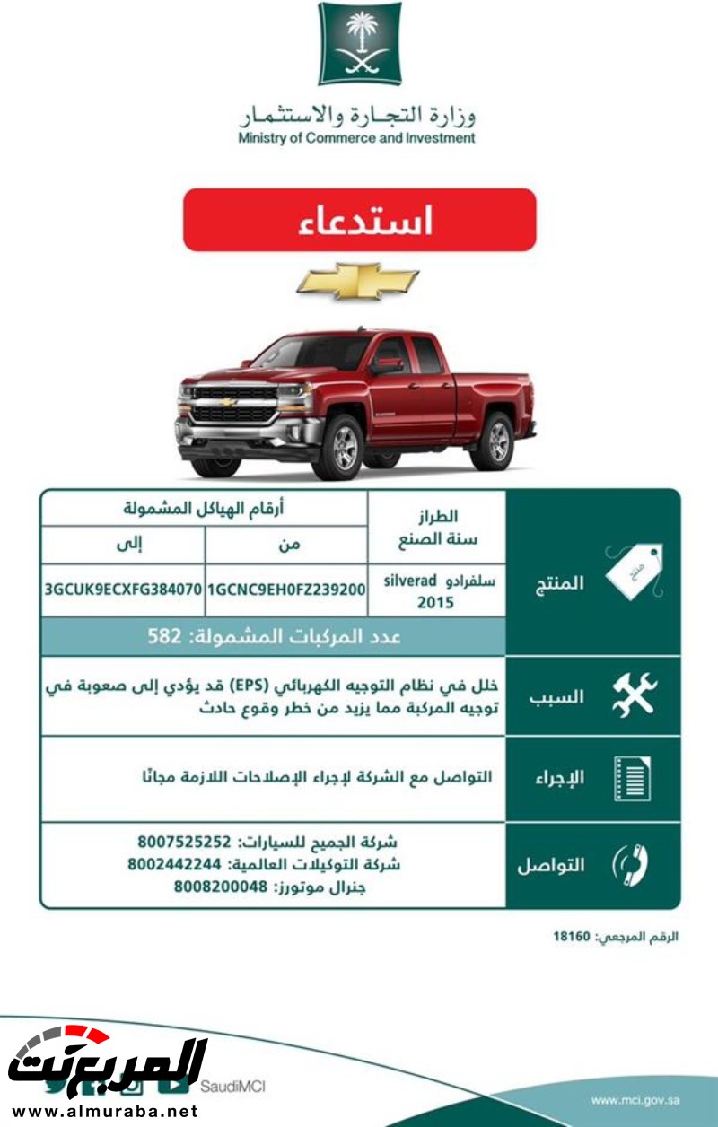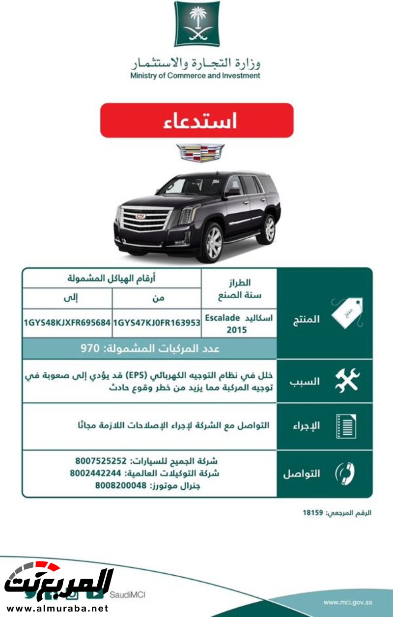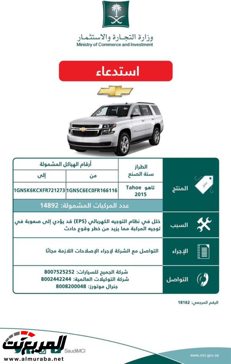 المربع نت – أعلنت وزارة التجارة والاستثمار عن استدعاء 37.8 ألف مركبة من “جنرال موتورز” موديل 2015، وهم: