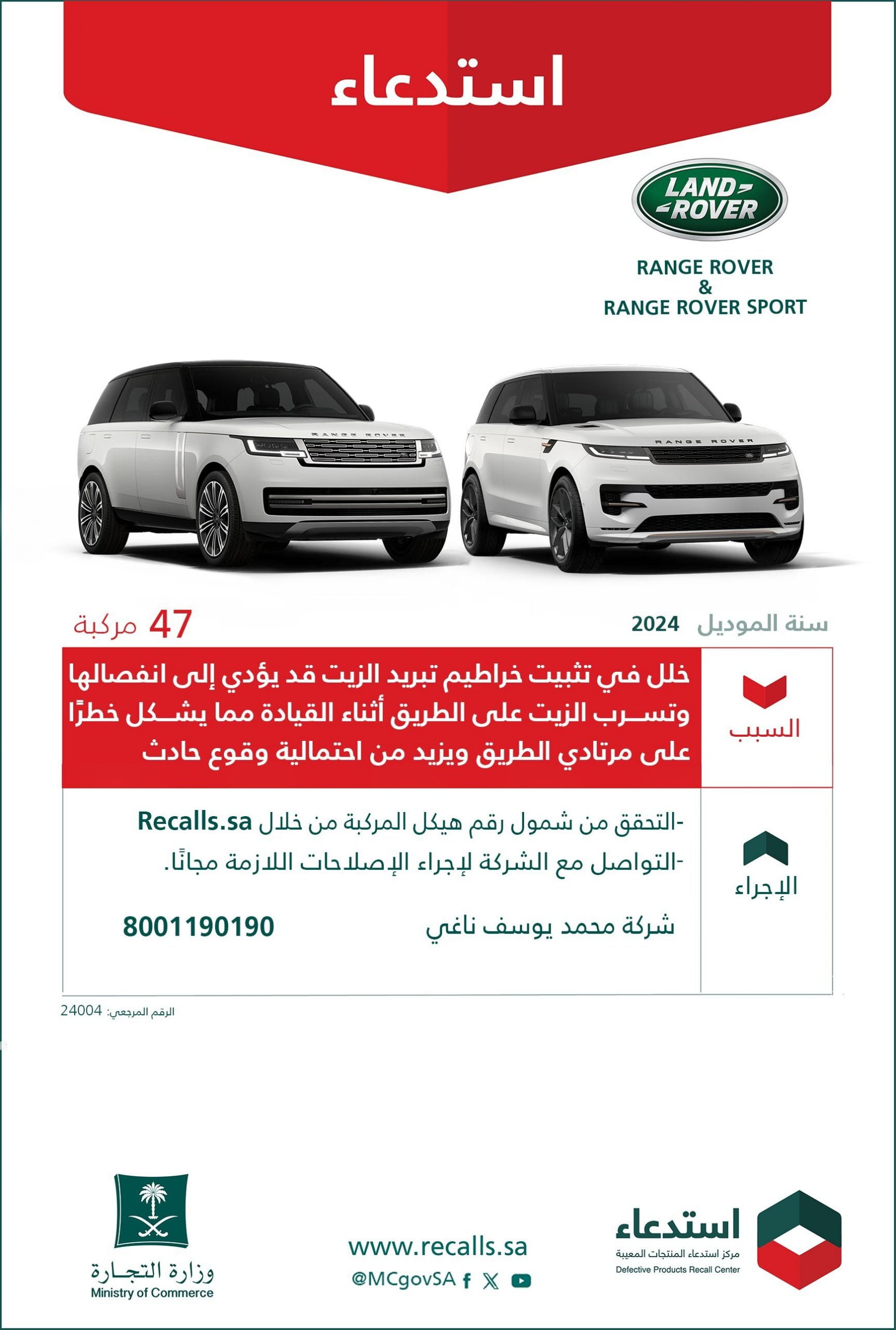 المربع نت – أعلن الحساب الرسمي لوزارة التجارة السعودي، اليوم الإثنين، عن استدعاء 47 مركبة لاند روفر من طراز ” Range Rover / Range Rover Sport ” موديل 2024، لخلل في تثبيت خراطيم الزيت.