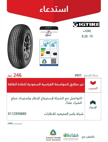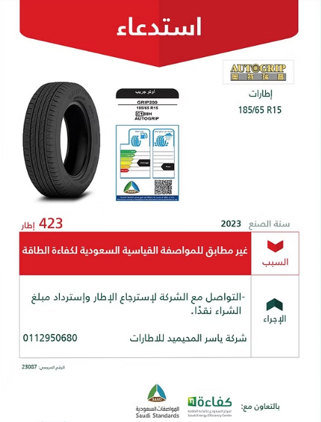 أوضحت الوزارة عبر “تويتر” أن سبب استدعاء إطارات ” Autogrip / IGT ” يعود لكونها غير مطابقة للمواصفة القياسية السعودية لكفاءة الطاقة.