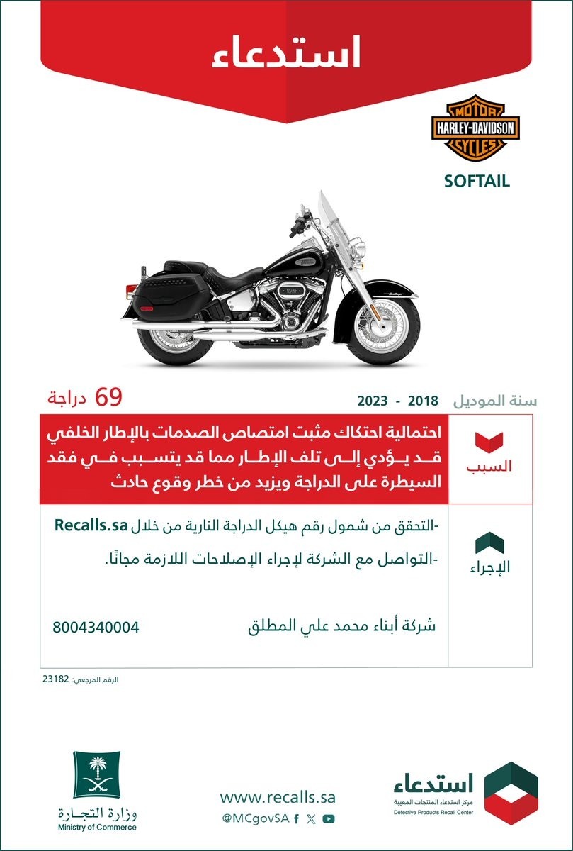 أوضحت وزارة التجارة من خلال إنفوجراف نشرته عبر منصة إكس، أن سبب استدعاء دراجات هارلي يعود إلى احتمالية احتكاك مثبت امتصاص الصدمات بالإطار الخلفي، مما قد يؤدي إلى تلف الإطار، الأمر الذي قد يتسبب في فقد السيطرة على الدراجة، ويزيد من خطر وقوع حادث.