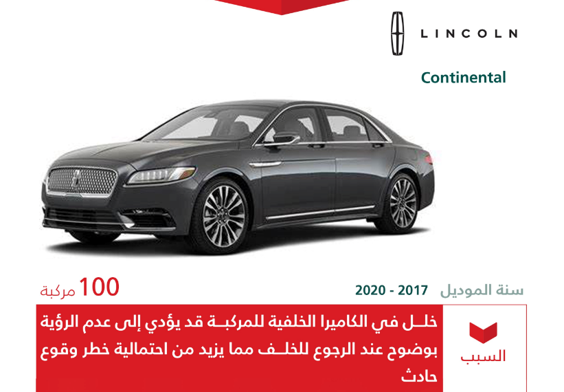 أوضحت الوزارة عبر منصة إكس، أن سبب استدعاء مركبات لينكون وفورد يعود لخلل في الكاميرا الخلفية للمركبة، قد يؤدي إلى عدم الرؤية بوضوح عند الرجوع للخلف، الأمر الذي يزيد من احتمالية خطر وقوع حوادث مرورية.