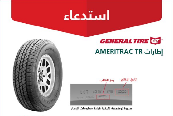 كذلك قامت باستدعاء 1,929 إطار GENERAL TIRE، ويرجع سبب الاستدعاء إلى احتمالية تعرض الإطارات لفقدان الهواء المفاجئ أو تلف في المداس، قد يؤدي إلى فقد السيطرة على المركبة أثناء القيادة مما يزيد خطر وقوع حادث.