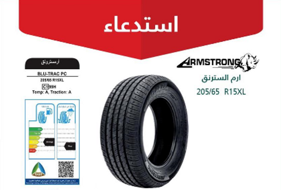 كما قامت الوزارة باستدعاء 730 إطار “ARMSTRONG”، ويعود سبب الاستدعاء إلى عدم مطابقتها للمواصفة القياسية السعودية لكفاءة الطاقة.
