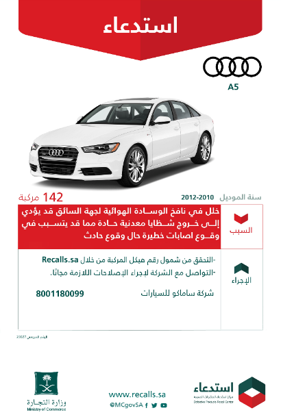 ونشرت وزارة التجارة إنفوجراف عبر “تويتر”، يوضح أسباب استدعاء مركبات أودي، مبينة أنه يعود إلى وجود خلل في نافخ الوسادة الهوائية لجهة سائق المركبة، مما يؤدي إلى خروج شظايا معدنية حادة في حال وقوع حادث، الأمر الذي قد يتسبب في وقوع إصابات خطيرة.