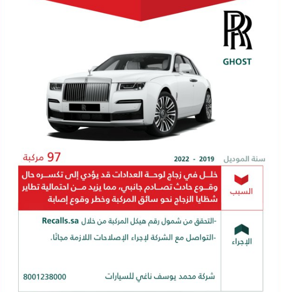 طالبت التجارة من ملاك مركبات رولز رويس التحقّق من شمول رقم هيكل المركبة من خلال موقع استدعاء المنتجات المعيبة (Recalla.sa)، ومن ثم التواصل مع شركة محمد يوسف ناغي لإجراء الإصلاحات اللازمة مجاناً.