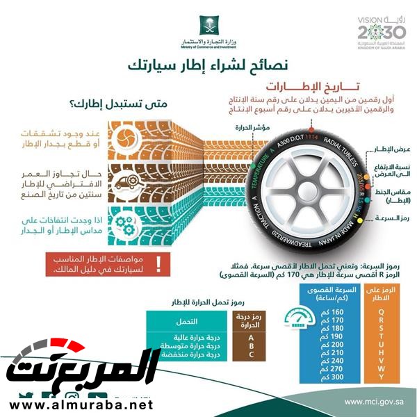 وكشفت الوزارة عن معاني رموز السرعة ومدى تحمل الإطار للحرارة، فقالت أن رموز السرعة تعني السرعة القصوى للإطار، وكمثال على ذلك، فإن الرمز “R” يدل على أن السرعة القصوى للإطار هي 170 كم، والرمز “W” يدل على أن السرعة القصوى للإطار هي 270 كم، لافتة إلى أن الرموز “A,B,C” توضح مستوى تحمل الإطار للحرارة العالية أو المتوسطة أو المنخفضة جداً.