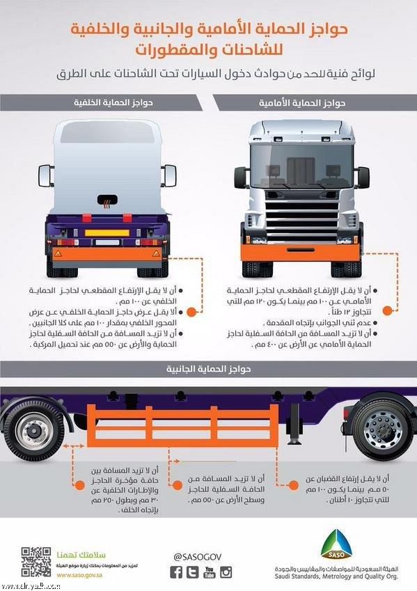 ووفقاً للمتحدث الرسمي للجمارك السعودية، عيسى العيسى، فإنه تم وضع آلية لتنظيم وتطبيق اللوائح الفنية السعودية الخاصة بالحواجز في الشاحنات والمقطورات، سواء كانت أمامية أو خلفية أو جانبية، مشدداً على منع عبور الشاحنات والمقطورات التي لا تتقيد بهذه اللوائح.