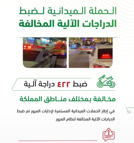 كما كشف المرور السعودي عبر “تويتر” عن قيام إدارات المرور بمختلف مناطق المملكة بتنفيذ الحملة الميدانية لضبط الدراجات النارية المخالفة، مبينًا نجاح الحملات في ضبط 422 دراجة مخالفة، في مختلف أنحاء المملكة.