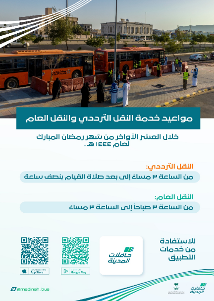 سيتم تقديم خدمة النقل الترددي ابتداءً من اليوم (الثلاثاء) من الساعة الثالثة مساءً ويستمر لما بعد صلاة القيام بنصف ساعة، وذلك كي يتناسب مع انتهاء وقت صلاة القيام في المسجد النبوي، ومسجد قباء.