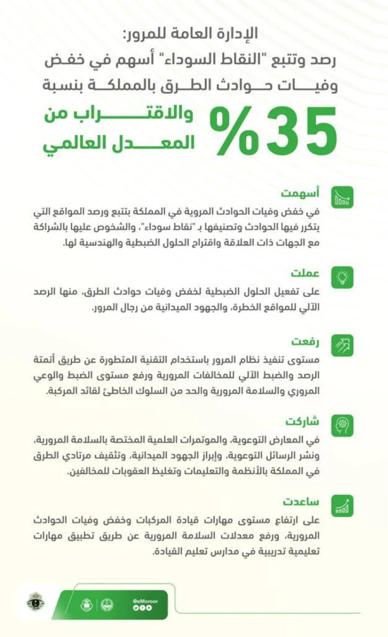 وأضافت إدارة المرور في بيان لها عبر منصة “إكس” أنها قامت بالشراكة مع الجهات ذات العلاقة من المختصين باقتراح الحلول الضبطية والهندسية لمواقع “النقاط السوداء”، مما ساهم في انخفاض الوفيات في الأعوام الخمسة الماضية بنسبة 35%، وفقًا لإعلان منظمة الصحة العالمية.