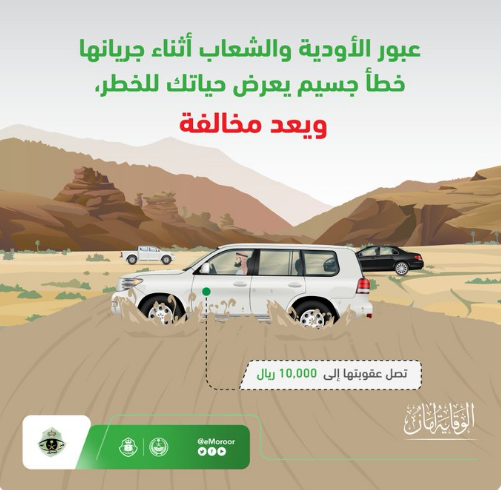 وأكدت على أن عبور الأودية والشعاب أثناء جريانها يعد مخالفة مرورية، ووفقًا لجدول المخالفات في نظام المرور، فإن غرامتها المالية تتراوح ما بين 5 آلاف إلى 10 آلاف ريال.