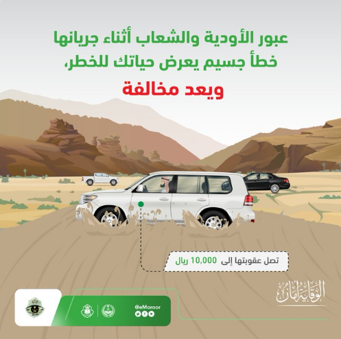 وأوضح المرور السعودي أن مخالفة عبور الأودية والشعاب أثناء جريانها جاءت في جدول مخالفات المرور، وتصل غرامتها على المخالفين إلى 10 آلاف ريال.