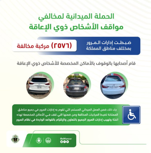 وأوضحت إدارة المرور عبر حسابها الرسمي على تويتر، أنه تم ضبط 2576 سيارة ضمن الحملة الميدانية التي تقوم به إدارات المرور في جميع أنحاء المملكة، وذلك لضبط السيارات المخالفة والتي تقف في الأماكن الخاصة للأشخاص ذوي الإعاقة.