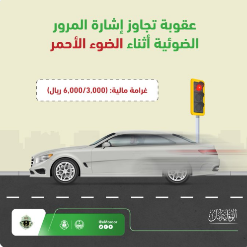 وأكدت إدارة المرور على أن تجاوز الإشارة الضوئية الحمراء تعد مخالفة مرورية وفقًا لنظام وقوانين المرور، تستلزم العقوبة، وتتراوح غرامتها المالية ما بين 3-6 آلاف ريال.