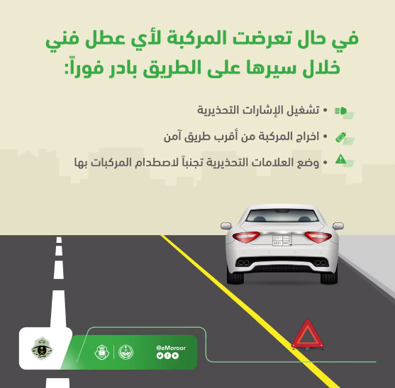 وقالت إدارة المرور في تغريدة لها: “في حال تعرضت المركبة لعطل أثناء سيرها على الطرق الرئيسة يجب عليك إخراج المركبة من أقرب طريق آمن مع وضع علامات التحذير تجنباً لوقوع الحوادث المرورية”.
