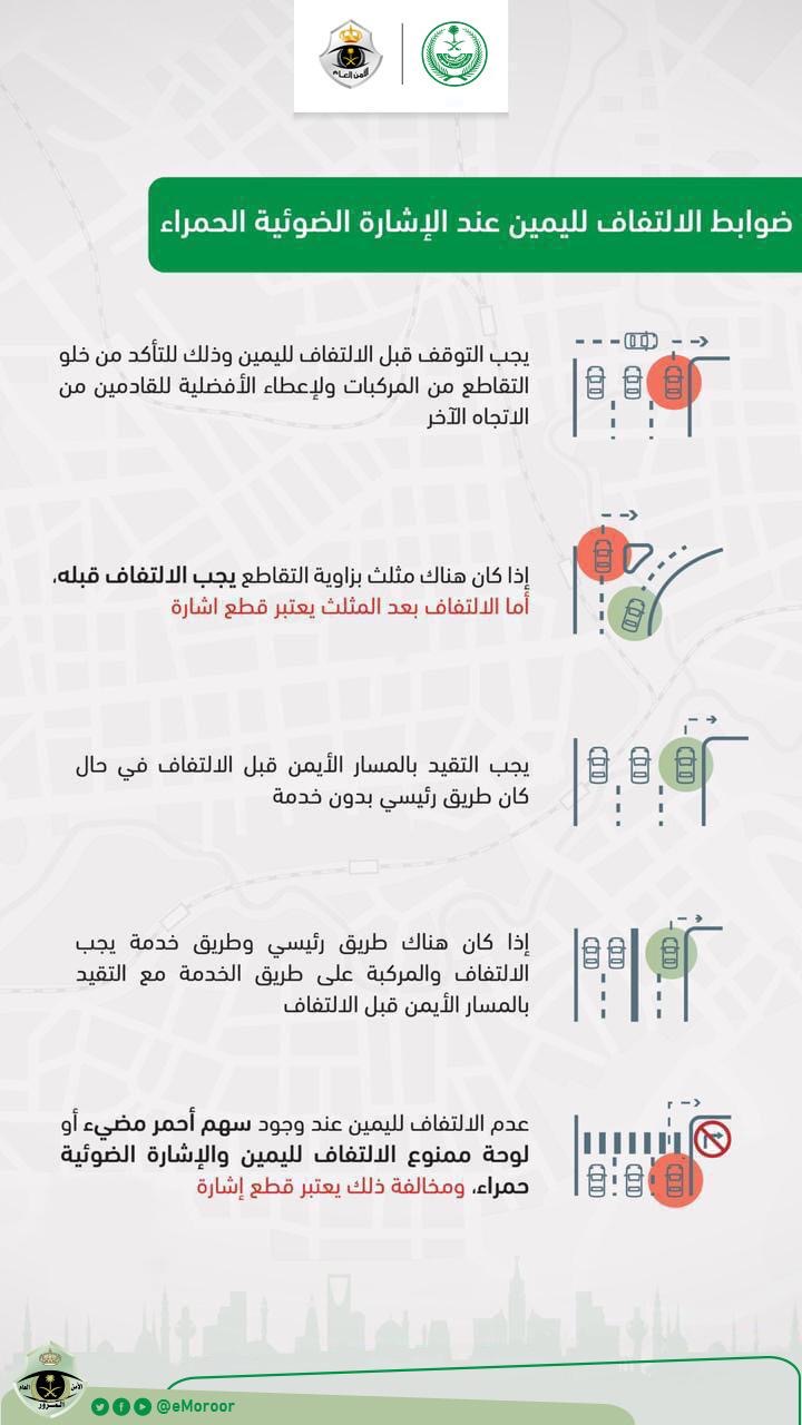– في حال وجود سهم أحمر مضيء أو لوحة ممنوع الالتفاف لليمين والإشارة الضوئية حمراء فإنه لا يجب الالتفاف إلى اليمين، ومخالفة ذلك يعد قطع إشارة.