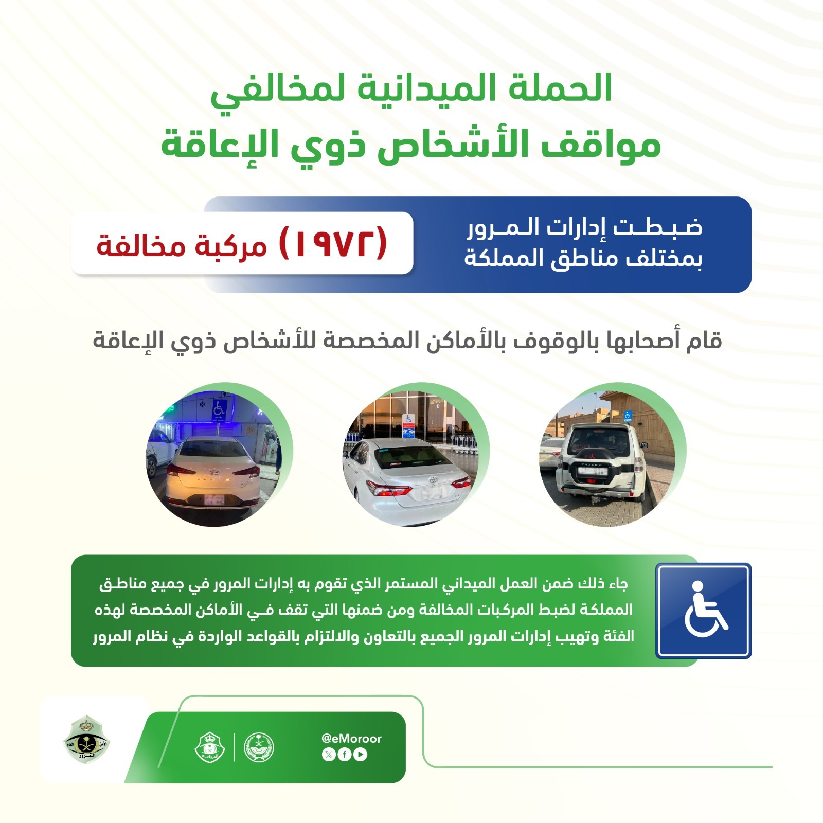 وفي سياق آخر، أعلن المرور السعودي عن تنفيذ الحملة الميدانية لضبط المركبات المتوقفة في الأماكن المخصصة للأشخاص ذوي الإعاقة، مشيرًا إلى نجاح الحملة في ضبط 1972 مركبة مخالفة بمختلف مناطق المملكة.