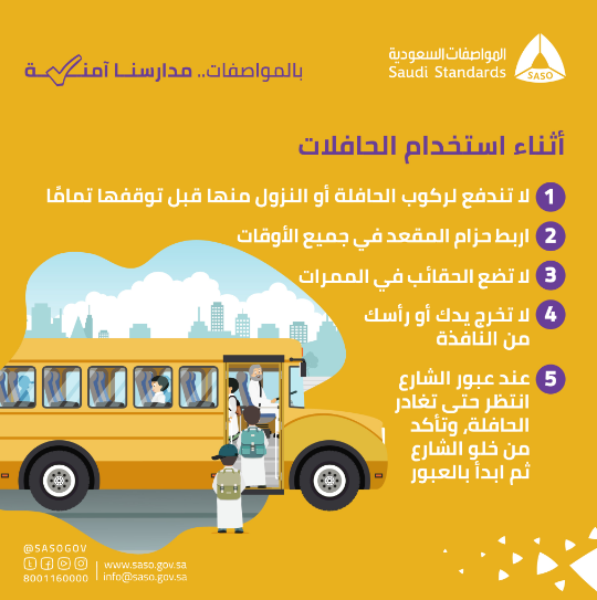 المربع نت – بالتزامن مع انطلاق العام الدراسي الجديد في المملكة، وجه الحساب الرسمي للهيئة السعودية للمواصفات والمقاييس والجودة رسائل توعوية وإرشادات هامة للطلاب والطالبات، لضمان سلامتهم أثناء تنقلهم بالحافلات المدرسية.