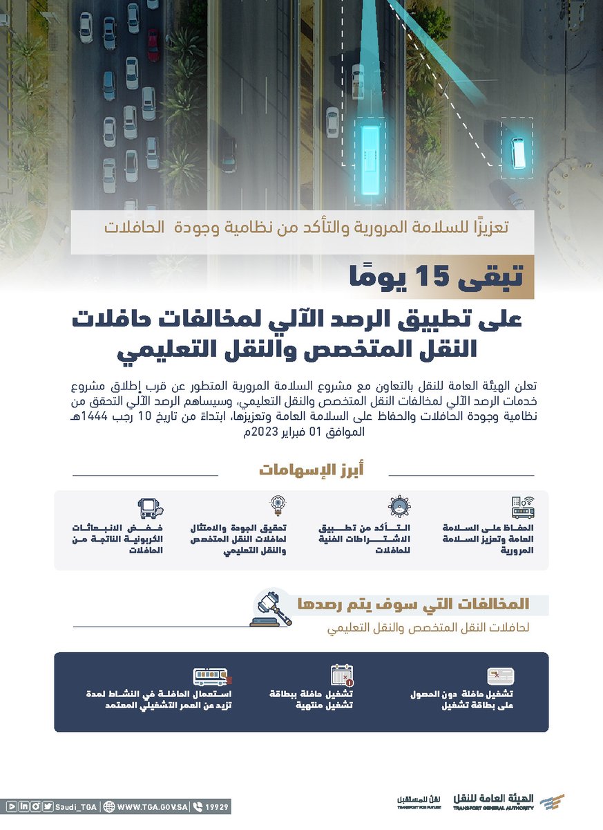 وأوضحت هيئة النقل أن تطبيق الرصد الآلي يأتي بالتعاون مع مشروع السلامة المرورية المتطور، والذي سيساهم في تحقيق نظامية وجودة الحافلات والحفاظ على السلامة العامة وتعزيزها، ومن المقرر البدء في تطبيقه في 1 فبراير 2023م.