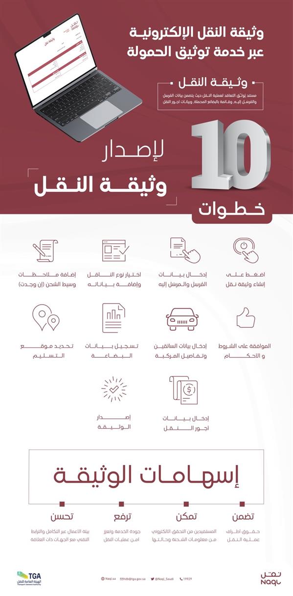 ونشرت هيئة النقل إنفوجراف عبر تويتر، يوضح خطوات إصدار وثيقة النقل، في البداية قم بالضغط على إنشاء وثيقة نقل، ثم قم بإدخال بيانات المرسل والمرسل إليه، وبعد ذلك قم باختيار نوع الناقل وإضافة بياناته، ثم قم بإضافة ملاحظات وسيط الشحن (إن وُجدت)، ثم قم بالموافقة على الشروط والأحكام.