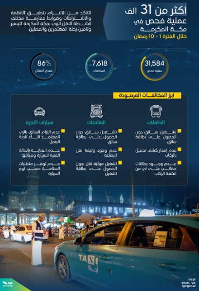 المربع نت – أعلنت الهيئة العامة للنقل السعودي، عبر حسابها الرسمي على تويتر، عن تنفيذ أكثر من 44 ألف عملية فحص ميدانية خلال العشرة أيام الأولى من شهر رمضان المبارك في مكة المكرمة والمدينة المنورة.