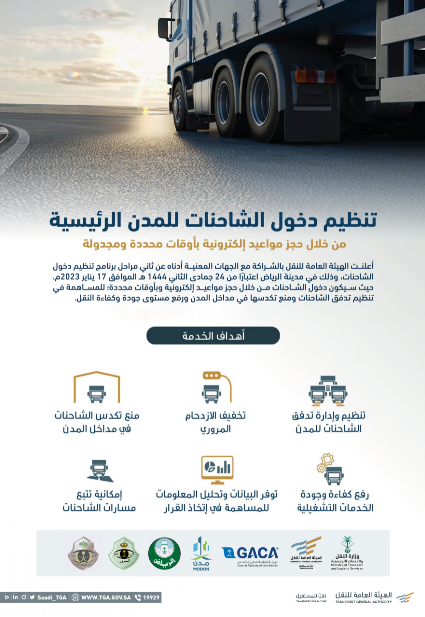 الجدير بالذكر، فإن “هيئة النقل” كانت قد أطلقت في وقت سابق خدمة تنظيم دخول الشاحنات للمدن الرئيسية، وبدأت في تطبيق هذه الخدمة في محافظة جدة كمرحلة أولى، وذلك بالشراكة مع هيئتي “المرور” و”الموانئ”.