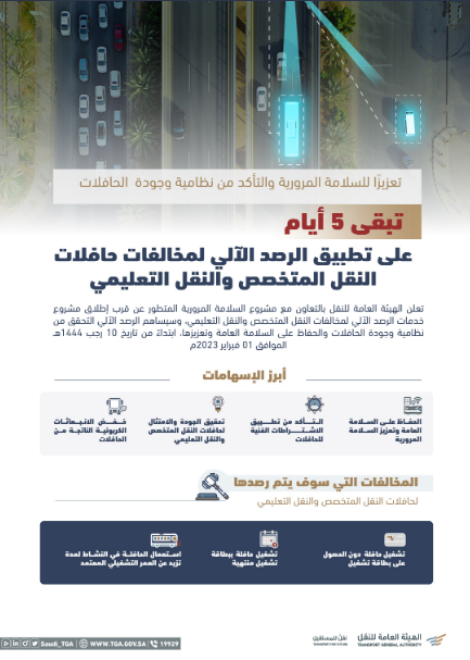 وكشفت هيئة النقل عن إطلاق مشروع خدمات الرصد الآلي لمخالفات النقل المتخصص والنقل التعليمي بالتعاون مع مشروع السلامة المرورية المتطور، بعد 5 أيام، وبالتحديد اعتبارًا من 10 رجب الجاري، الموافق 1 فبراير 2023م.