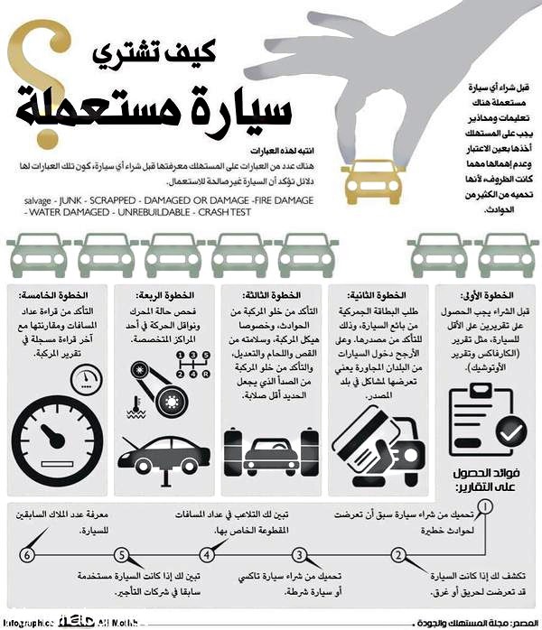 لربما يتخوف الكثيرون من شراء السيارات المستعملة,وذالك مخافة الوقوع فيما لايحمد عقباه من حوادث قد يتسبب فيها هذا النوع من السيارات,بسبب كثرة الأعطاب الظاهرة وأحيانا الخفية فيها,ولتفادي هكذا أمور إليكم انفوجرافيك يتضمن مجموعة من التعليمات والإرشادات تحمي المستهلك في حال أٌقبل على شراء سيارة مستعملة: