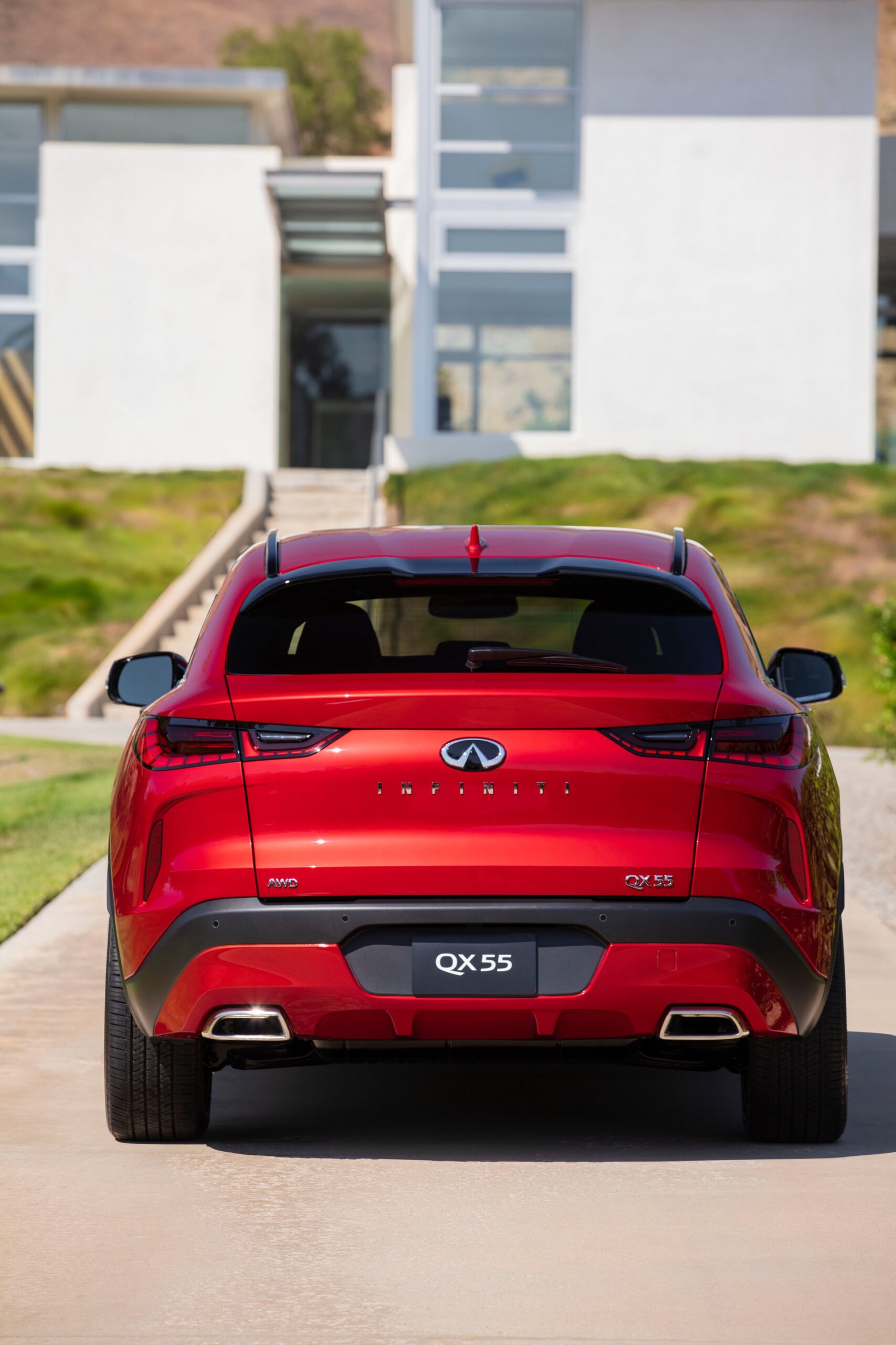في الوراء نرى المصابيح الخلفية LED الأنيقة ونظام عادم ثنائي.. وبالانتقال للداخلية نرى شاشتين لمسيتين 7 و8 إنش مع لوحة عدادات “أنالوج” تقليدية، وستكون QX55 أول سيارة انفينيتي تدعم تطبيق ابل كاربلاي اللاسلكي.
