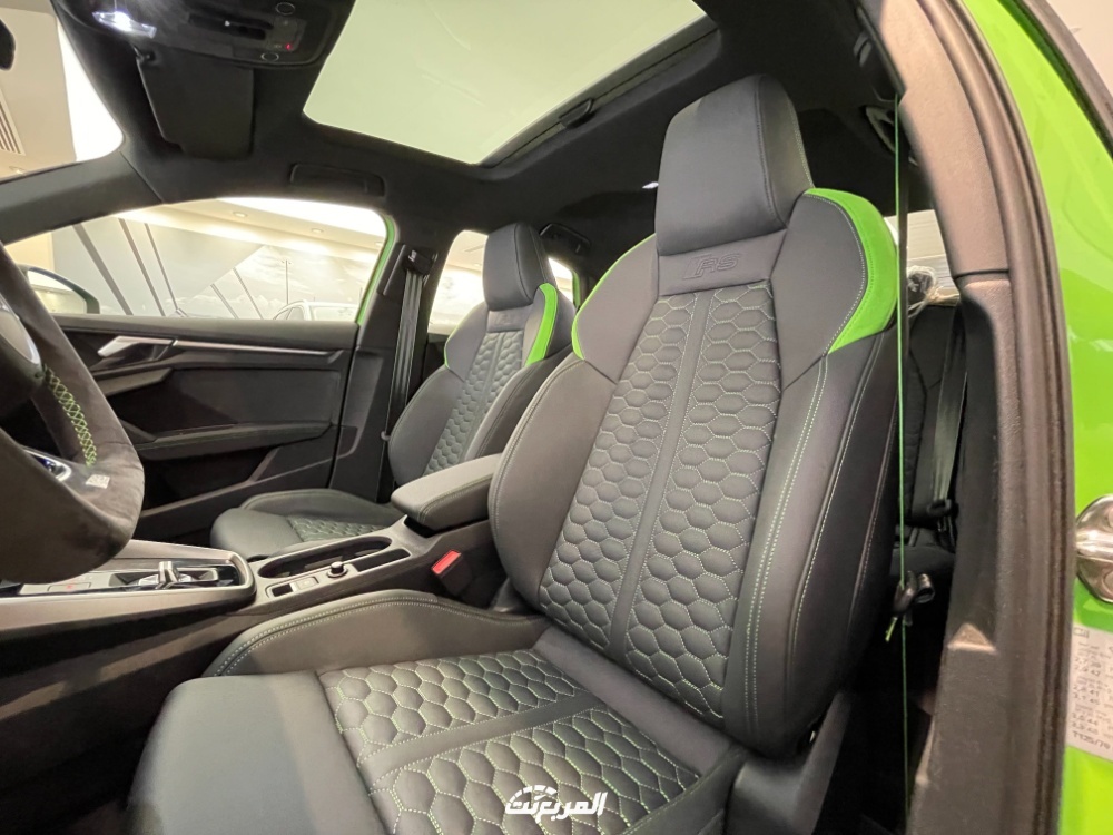 بالحديث عن التصميم الخاصة بمقصورة اودي RS3 موديل 2022 الجديدة، نرى الطابع الرياضي المميز من اودي، ومقاعد رياضية من جلد النابا الفاخرة، مع التصميم الأكثر حدة، مع مقود قيادة من الجلد الفاخرة متعدد الوظائف، وشاشة العدادات المميزة من اودي، وشاشة لمسية متعددة الوظائف مقاس 12.3 بوصة، بالإضافة إلى شاشة عرض على الزجاج الأمامي، والتي تقوم بعرض المعلومات على الزجاج الأمامي في خط رؤية السائق المباشر، ومكيف هواء أوتوماتيكي.