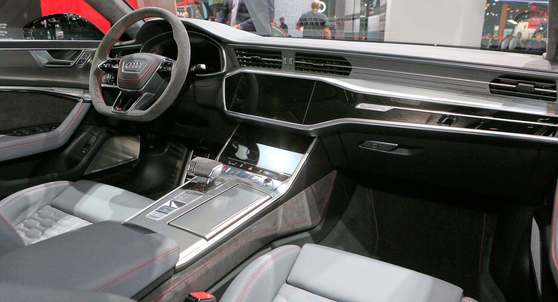 داخلية RS7 سبورتباك لا تختلف كثيراً عن موديلات A7 الأخرى ولكن مع إضافة مقود رياضي بجلود مثقوبة مع دواسات من الألومنيوم وشاشات عرض خاصة بـ RS في لوحة عدادات اودي الافتراضية، مع مقاعد رياضية مميزة لـ RS كذلك وشعارات RS في مختلف أنحاء المقصورة.