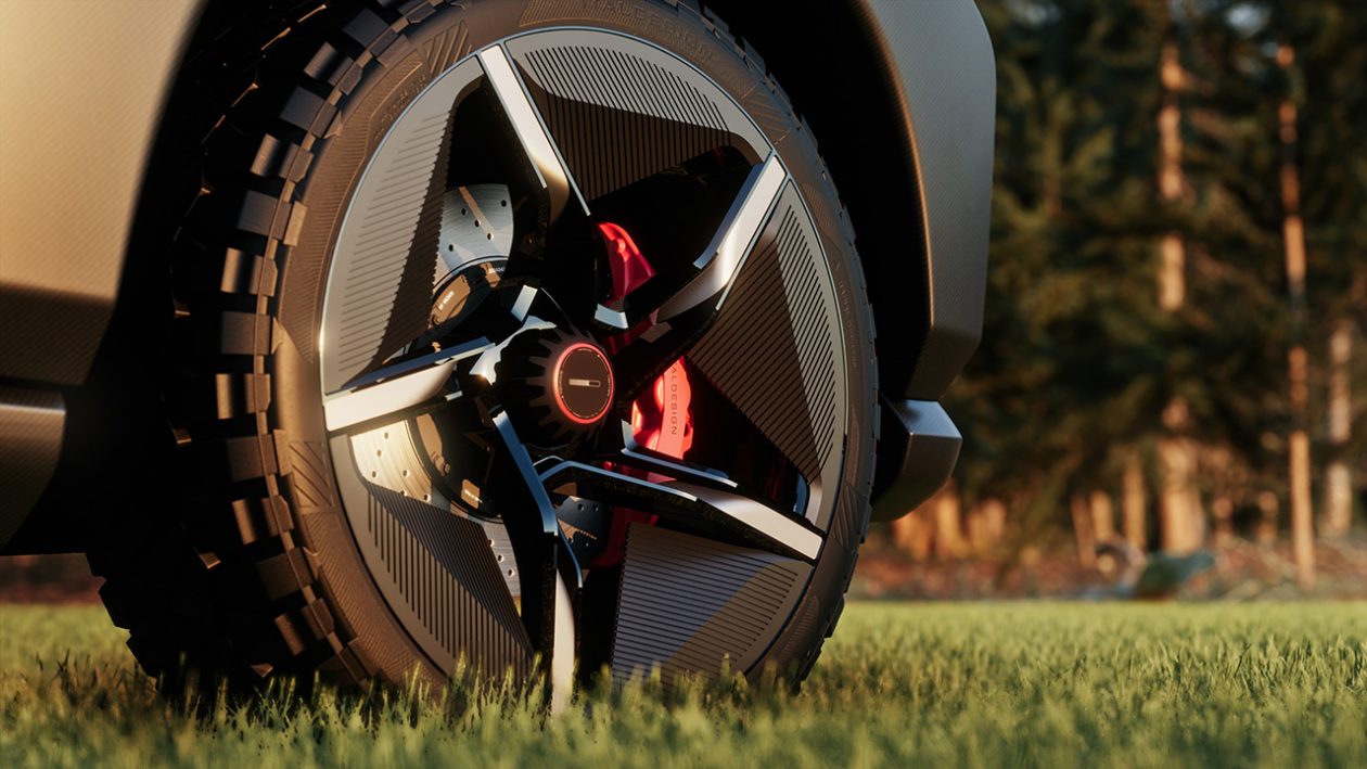 على جانبي الشاحنة سوف نرى أقواس العجلات العريض مع قاعدة عجلات بطول 3,240 مم مع خلوص أرضي يتراوح بين 200-280 مم حسب وضع القيادة المختار بفضل نظام التعليق الكهربائية.