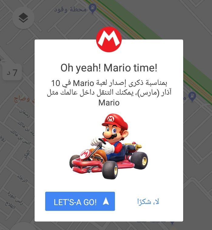 بمجرد تحديث التطبيق، وبعد إدخال وجهتك، ستلاحظ علامة استفهام صفراء أسفل يمين الشاشة ويظهر لك خيار تفعيل ماريو تايم، لذا عليك الضغط عليه بدلاً من الزر الأزرق المعتاد، وعلى الفور سيتحول سهم الملاحة إلى ماريو بسيارته جو كارت الحمراء.
