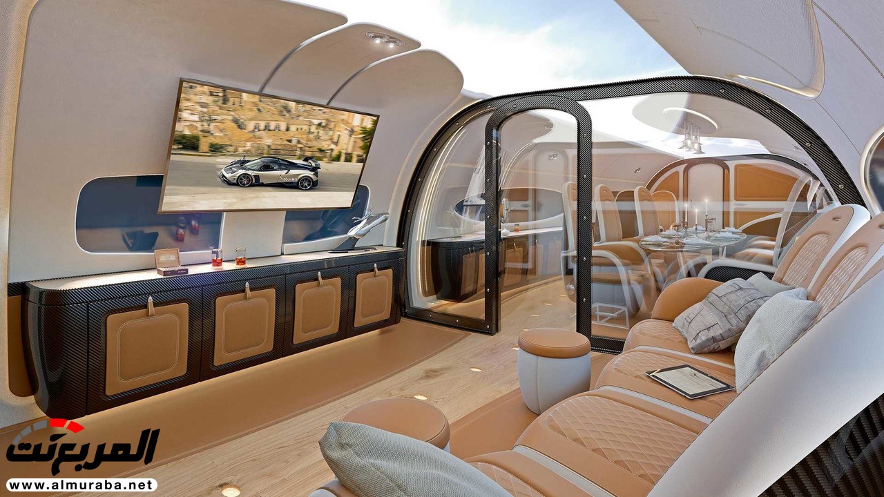 كما ترون، فالمقصورة تعطي شعورًا كما لو أنّها داخل سيارة باجاني، بالسجاد ذو الجلد الطبيعي والتباين الكربونية يدوي الصناعة، والأثاث وهيكل السقف، ولأجل الخروج بهذه التحفة الفنية استوحي تصميمها من مزيج من الفن والعلم بفلسفة مبتكرة من ليوناردو دي فينشي.