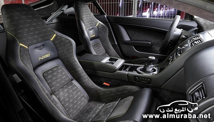 داخلية آستون مارتن V8 فانتيج N430 مزينة بشارات معدنية وبدالات يدوية سوداء من المغنيسيوم مع تزيين من ألياف الكربون مع فرش جلدي انيق.