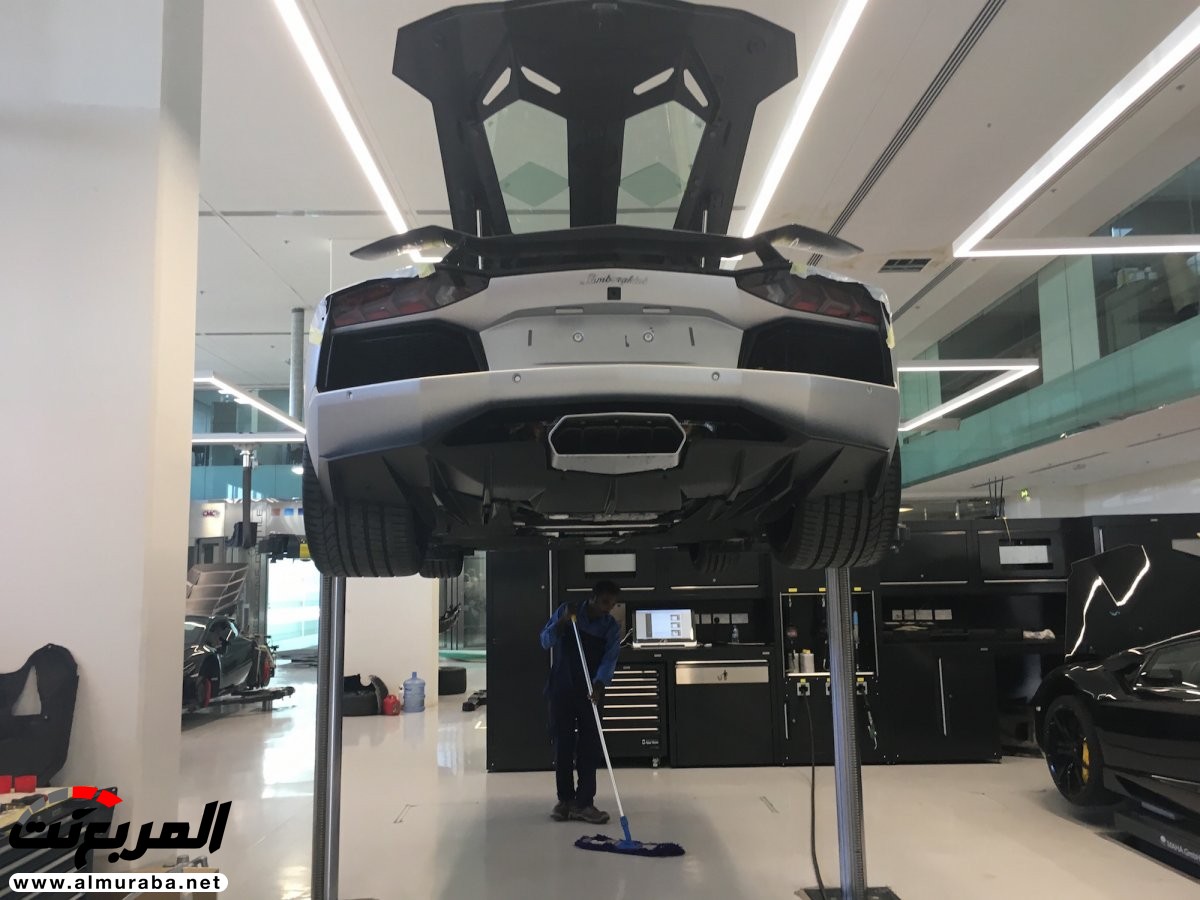أما عن ورش العمل بالوكالة، فهي لا تفتقر أبدا إلى السيارات، فهي تحتوي على سيارتي أفنتادور وسيارة هوراكان، بالإضافة إلى النسخة البنفسجية التي تم إنتاجها للإحتفال بمرور ثلاثين عاما على ديابلو ونسخة لأوروس.