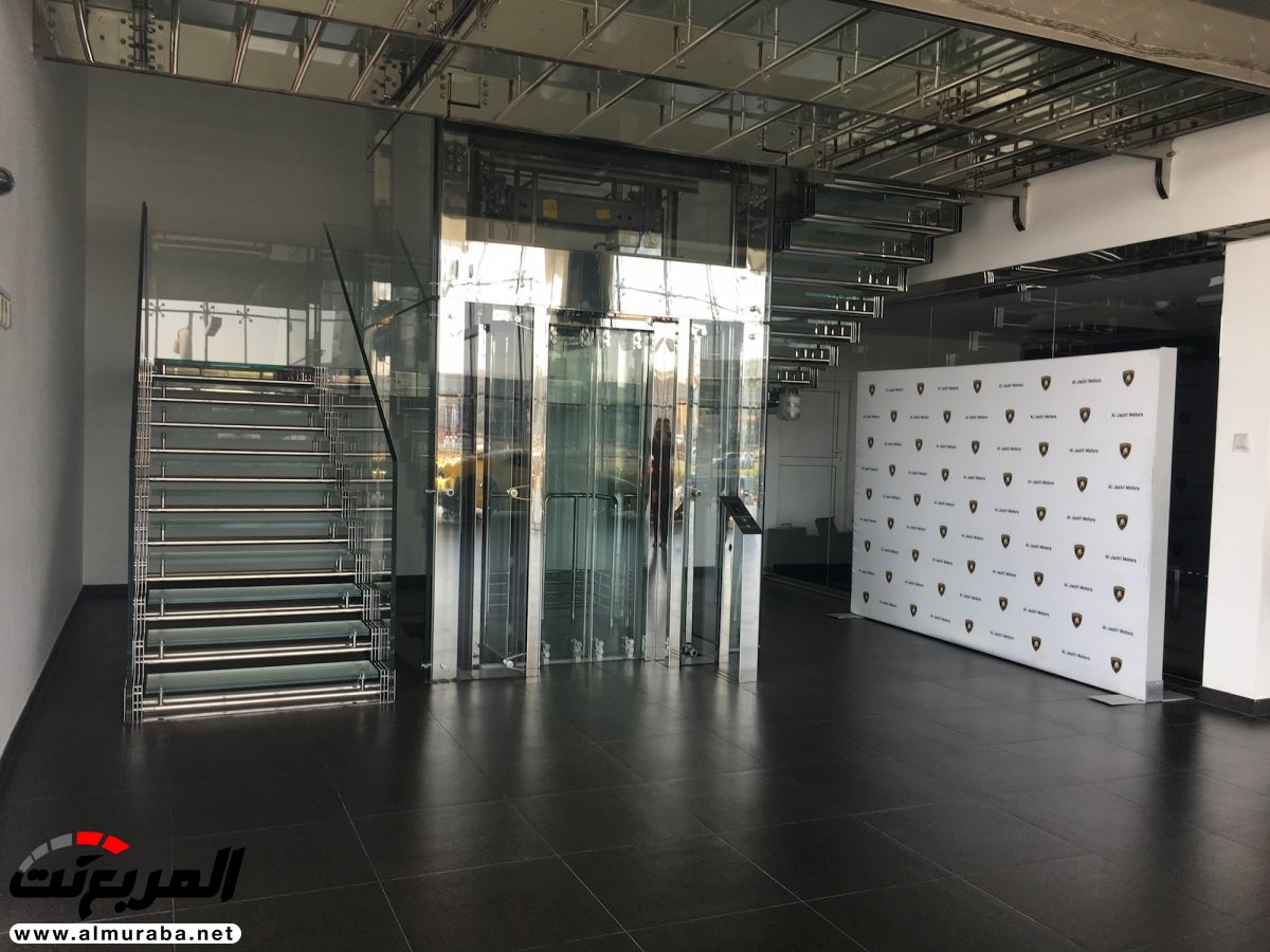 وبمجرد الدخول من الأبواب الزجاجية، ستجد نفسك في صالة العرض الرئيسية، مقابلا لسيارتي أفينتادور وأخرى هوراكان. كما ستجد في نفس الطابق، غرف مخصصة للإجتماعات وأخرى لعمليات البيع.