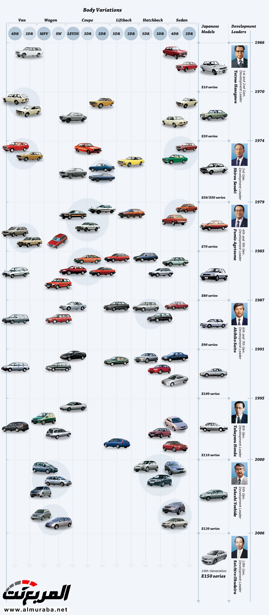 المربع نت – تم تقديم تويوتا كورولا لأول مرة في عام 1966 كسيارة سيدان صغيرة، وخلال 8 أعوام فقط بحلول 1974، أصبحت السيارة الأكثر مبيعاً في العالم، وبعد مرور عدة سنوات أخرى في عام 1997، تم تتويج كورولا بلقب السيارة الأكثر مبيعاً في تاريخ الصناعة بأكملها، حيث عرفها الجميع بأنها السيارة العائلية الصغيرة ذات معدلات الاعتمادية التي لا تُضاهى، وقد كانت تأتي في البداية مع نظام دفع خلفي، قبل أن تتحول للدفع الأمامي لأجل تخفيف الوزن وتقليل استهلاك البنزين مع زيادة المساحة الداخلية، وسوف نعرض لكم اليوم لمحة مبسطة عن تاريخها.